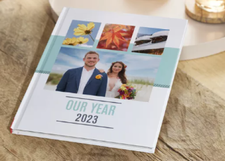 En fotobog med billedtrykt hardcover omslag i A5 størrelse.